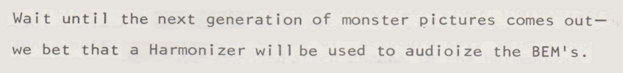 The original User Manual predicted that the Harmonizer would be used to audioize BEMs (Bug Eyed Monsters).