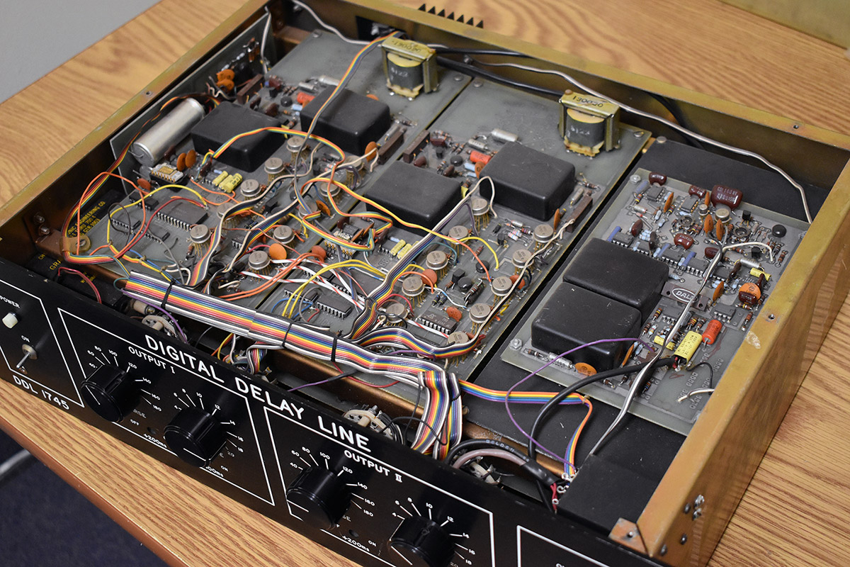 Eventide’s first DDL, the 1745, was a 3U rackmount box with one input and two outputs. Each output was capable of delaying audio up to 200 msec of delay (adjustable in two msec increments). The box was packed with over 100 shift registers connected in series and the digital bits moved through them like water through a pipeline. That’s why it was called a “Delay Line”.