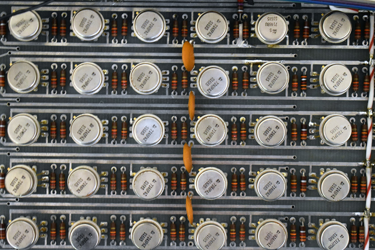 Each individual shift register delayed audio by two msec. The shift registers were laid out in nine rows of 10 shift registers each for selecting coarse delay in 20 msec increments and an additional 10 shift registers were mounted on each output board for adding up to an additional 20 msec in 2 msec increments.