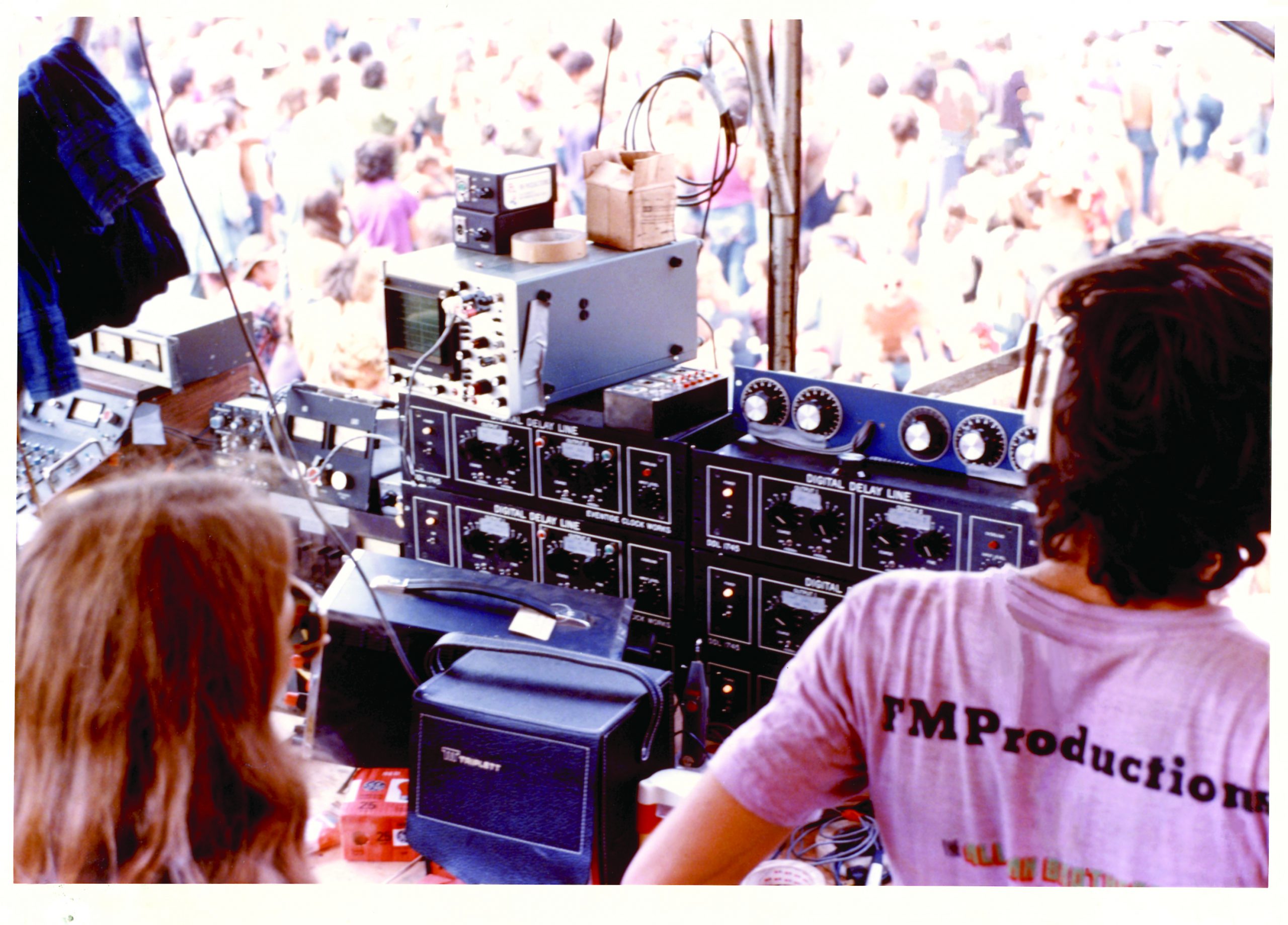 In 1973, an outdoor rock festival was held that drew a record-breaking crowd of 600,000 people. The Grateful Dead were one of the headliners and they had arranged for the PA system. Given the size of the crowd, a series of speaker towers were set up hundreds of feet from the stage. The previous experience with using speaker towers had been less than gratifying since the sound travelling through the air from the stage would arrive after the sound coming out of the closest speaker. For fans hundreds of feet back from the stage yet close to a speaker tower, the result was a disorienting echo. Eventide worked with the sound crew and supplied a stack of 1745 delay lines to delay the audio feed to the towers by an amount equal to the estimated delay of the stage sound travelling through the air. It worked like a charm. We believe that this was the first use of digital delay for sound reinforcement.