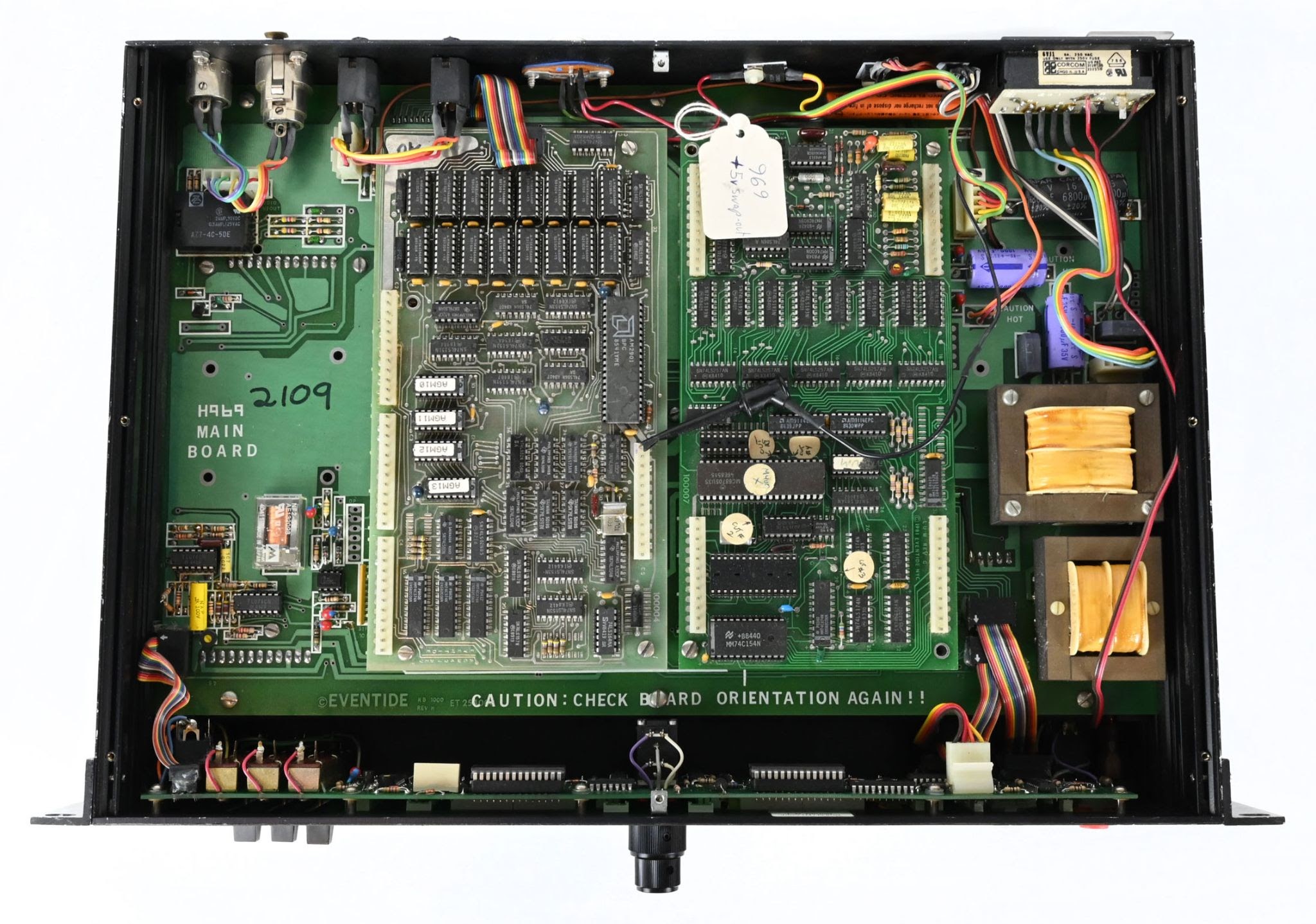 Internally, there was a rigid motherboard and several plug-in modules. At the time, the idea was to allow upgrading; but that never actually occurred. What did happen though, is that this architecture enabled different designers to work on different parts of the project. The H969 was one of the few Eventide products from that era that was designed by more than one person; Tony Agnello, Richard Factor, and me.