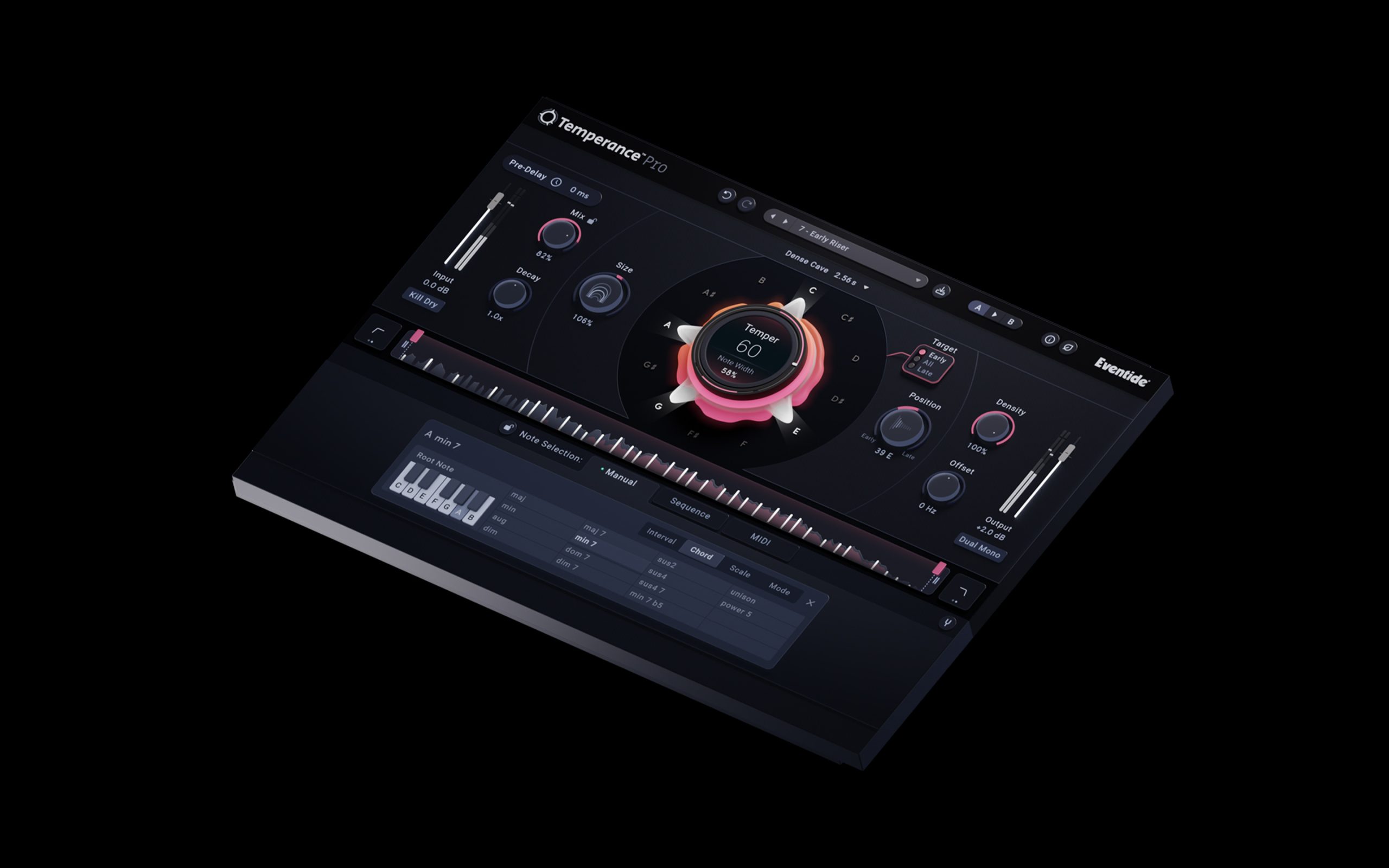 Temperance Pro speaks the language of music, operating on the 12-note chromatic scale to determine which notes bloom or fade within space. Its expanded control set shapes musical texture, directs movement, and unlocks 29 world-class spaces built entirely on modal technology.