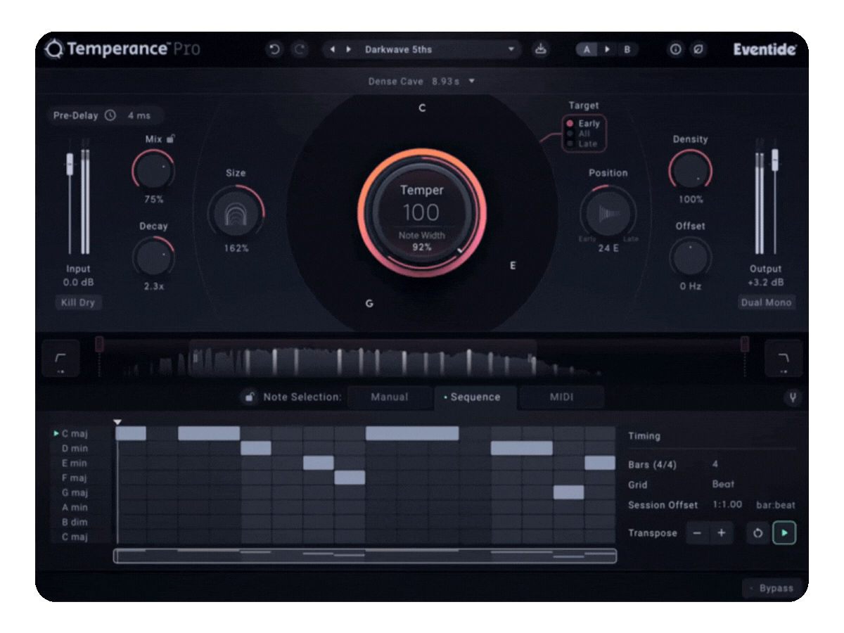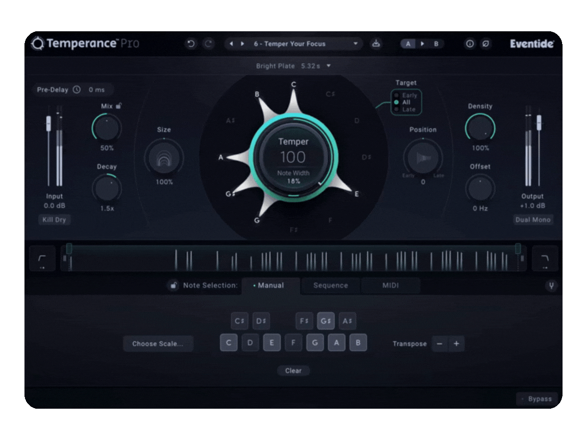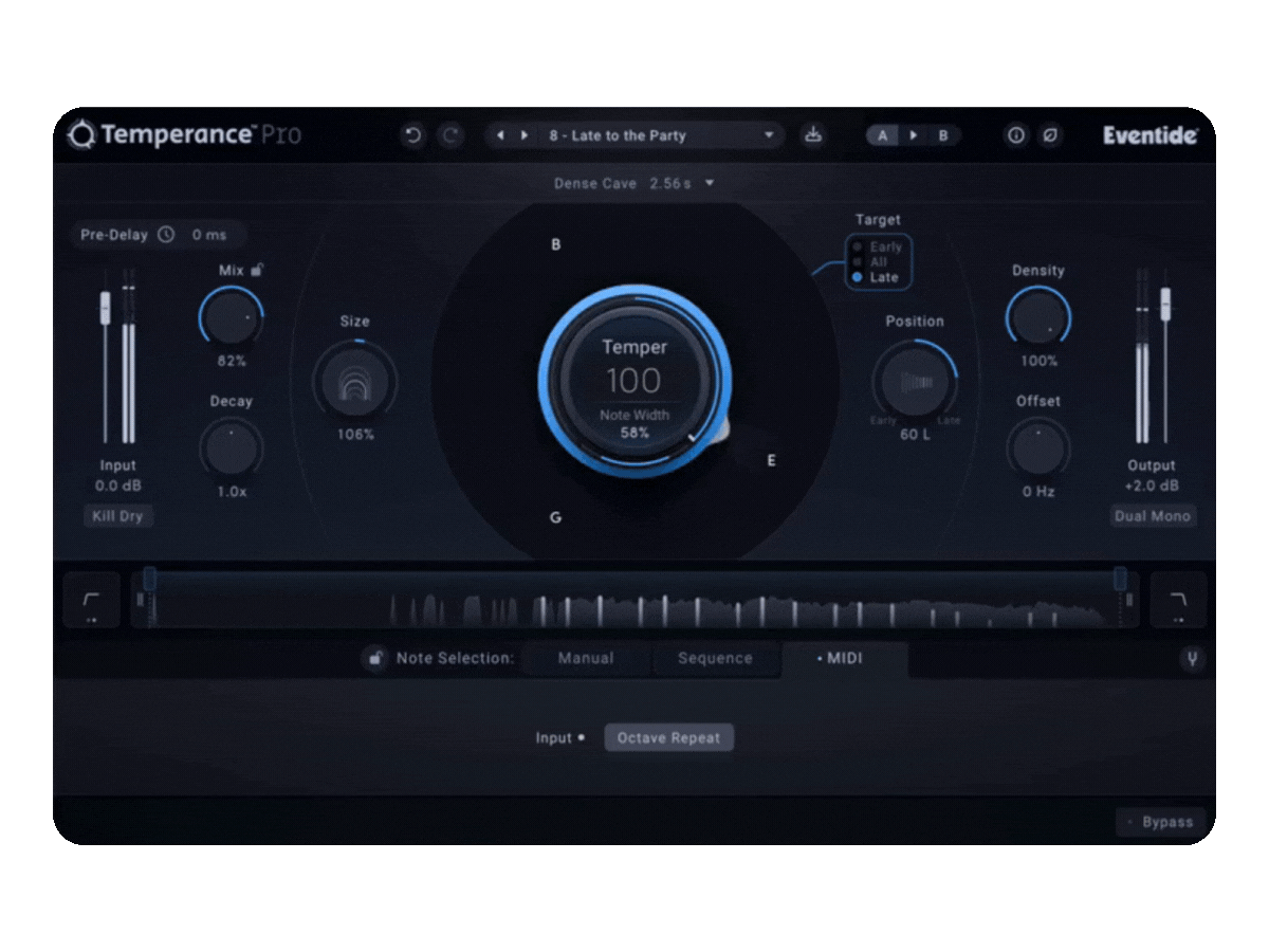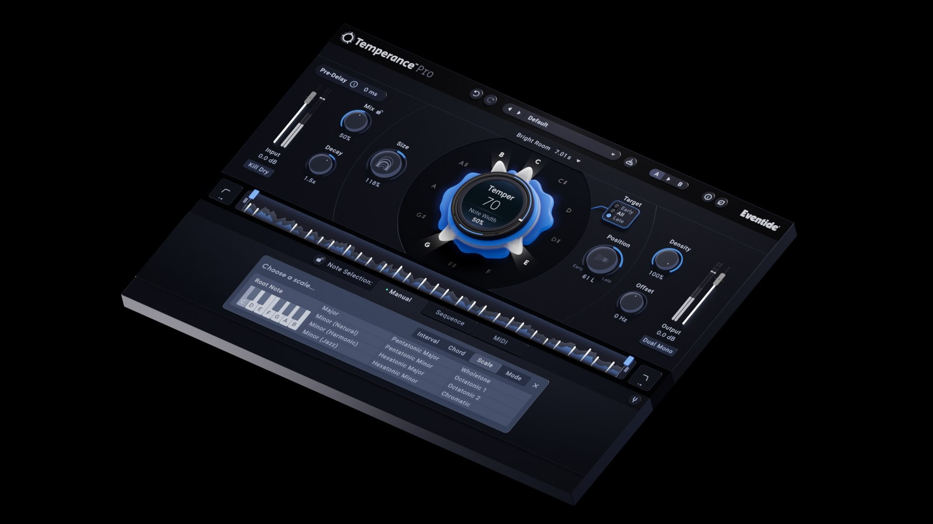 Temper and Range controls dial in the musicality of the reverb, adjusting the amount of emphasis or de-emphasis applied to the selected notes, and choosing which octaves are tempered.