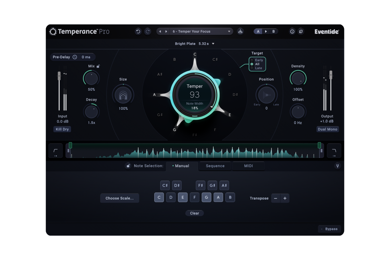 Conceptually simple! Use a modal model to design a reverb that would change the sound of notes in the room by emphasizing the level and decay of the frequencies of the twelve-note scale. However, such a design would involve being able to control the ‘modes’ of the room; lots of them. Lots.