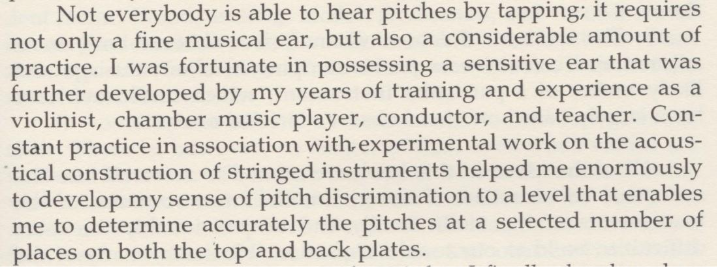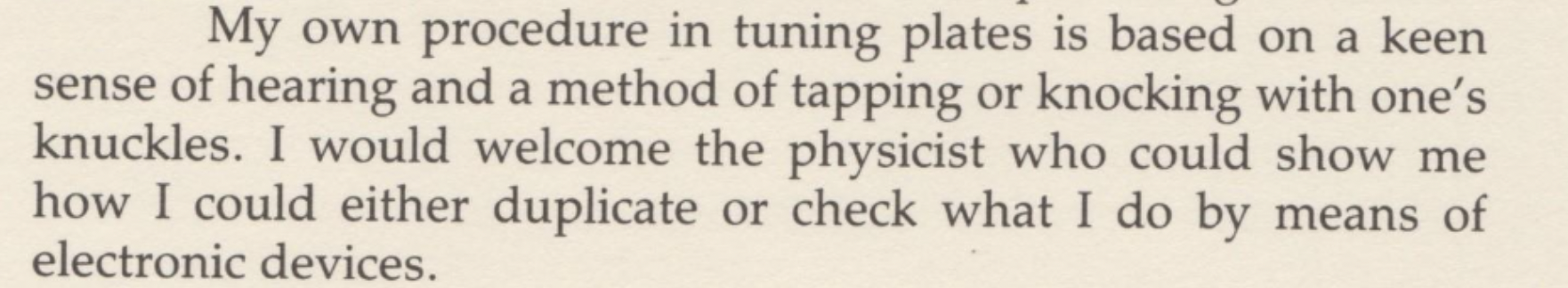 Isaak’s keen tapping method and his pitch perfect hearing led him to hypothesize that the luthiers who built these unique instruments were able to shave the plates such that they would ring out/resonate at the 12 notes of the western musical scale. Page 99.
