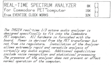 A year or so earlier, in 1980, Eventide’s founder and instrument maven, Richard Factor, was the first to demonstrate that a computer can be used as a piece of test equipment. He had designed an add-in card for one of the first personal computers, the Commodore PET, turning the computer into a third-octave real-time audio spectrum analyzer.